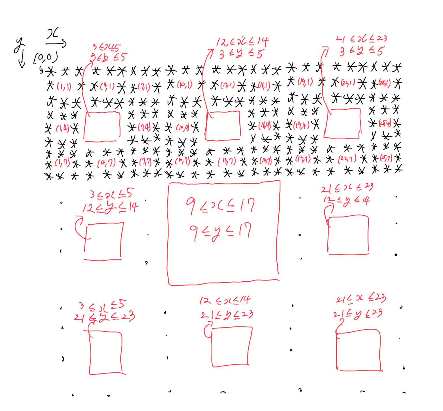 좌표를 잘 관찰해 보면 재밌는 현상들을 발견할 수 있다. 예를 들면, 3 * 3 공백들의 x 좌표와 y 좌표 / (N / 3^2)의 값이 다시 1, 4, 7 이 나온다. 재귀 호출을 따라가보며 관찰해보자.