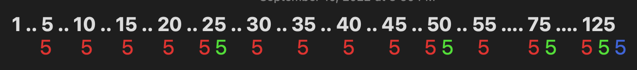 해당 수의 25의 배수의 개수를 세는 것은 곧 25가 가지고 오는 추가적인 5의 개수를 센다는 이야기이고, 125의 배수의 개수를 세는 것은 곧 125가 가지고 오는 추가적인 5의 개수를 센다는 이야기이다. 이를 그림으로 표현하면 다음과 같다.